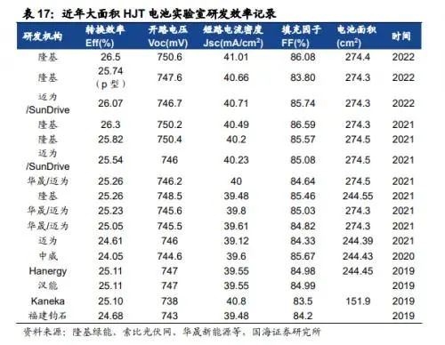 1、HJT電池可以擁有很高的轉(zhuǎn)化效率,大面積的電池轉(zhuǎn)化效率都已能比較輕易的突破25%,今年隆基更是將最高記錄刷新至26.5%。