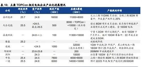 組件端龍頭引領(lǐng),TOPCon進(jìn)入規(guī)模化量產(chǎn)元年,溢價(jià)下經(jīng)濟(jì)性初現(xiàn),國海證券列舉了各大龍頭布局情況: