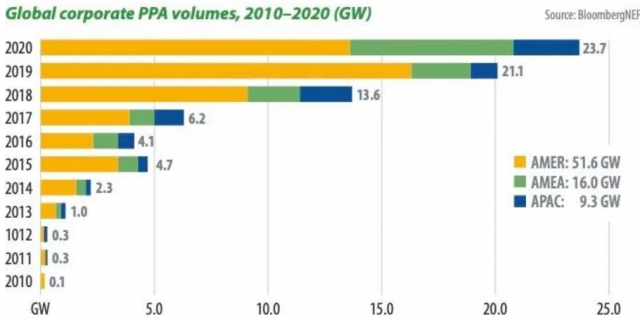 根據(jù)BNEF的數(shù)據(jù),2020年公司性PPA(主要是太陽能和風(fēng)能)的容量飆升至創(chuàng)紀(jì)錄的23.7GW。而這種上升趨勢將一直延續(xù)。
