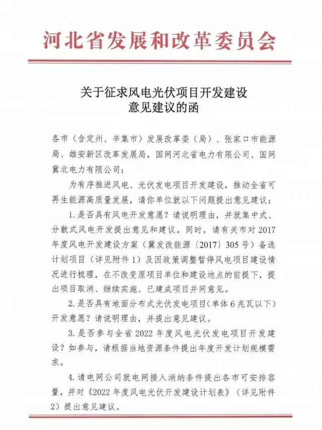 在征求意見函中,河北省發(fā)改委要求各地主管部門就風(fēng)電、地面分布式光伏開發(fā)意愿進(jìn)行說明,并請(qǐng)電網(wǎng)公司就電網(wǎng)接入消納條件提出各市可安排容量,并對(duì)《2022年度風(fēng)電光伏開發(fā)建設(shè)計(jì)劃表》提出意見建議。