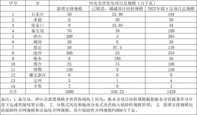 根據(jù)公示的2022年風(fēng)光開發(fā)建設(shè)規(guī)模表,河北省2022年擬下達(dá)風(fēng)光項(xiàng)目14.29GW,分布在石家莊、承德、張家口、秦皇島等14個(gè)市。其中,已取消、調(diào)減項(xiàng)目結(jié)轉(zhuǎn)規(guī)模5.58GW,新增規(guī)模規(guī)模為10GW。