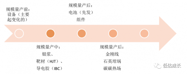 投資維度1:短期看業(yè)績(jī)釋放順序,設(shè)備>新輔材>電池組件>老輔材。