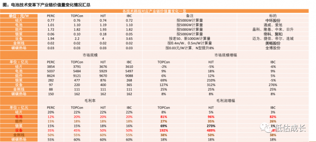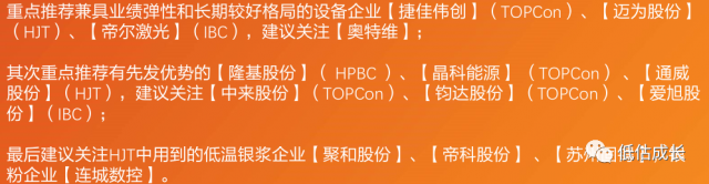 核心結(jié)論為:短期TOPCon與P型IBC具有優(yōu)勢(shì),中期TOPCon、HJT、IBC或?qū)⒐泊?,長(zhǎng)期預(yù)計(jì)將往TBC&HBC轉(zhuǎn)型;新技術(shù)變化下,較看好設(shè)備、電池組件、銀漿&銀粉。