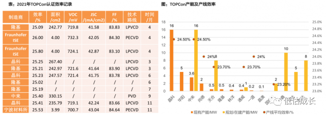 TOPCon:已有29GW在產(chǎn),22年規(guī)劃超40GW,龍頭量產(chǎn)平均效率24.5%。
