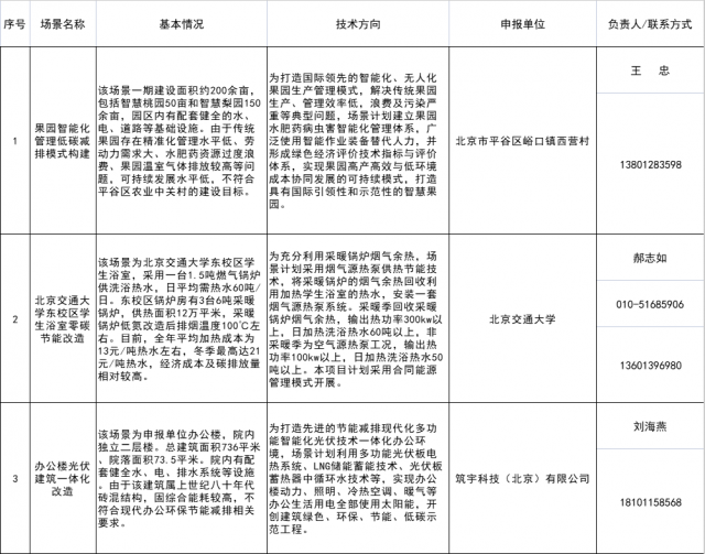為推進(jìn)本市構(gòu)建市場導(dǎo)向的綠色技術(shù)創(chuàng)新體系工作,根據(jù)《北京市關(guān)于進(jìn)一步完善市場導(dǎo)向的綠色技術(shù)創(chuàng)新體系若干措施》(京發(fā)改〔2021〕1411號,以下簡稱《若干措施》)、《北京市創(chuàng)新型綠色技術(shù)及示范應(yīng)用項(xiàng)目征集遴選管理細(xì)則》(京發(fā)改規(guī)〔2021〕9號),我們組織開展了創(chuàng)新型綠色技術(shù)應(yīng)用場景征集工作。經(jīng)公開征集、資料審核和現(xiàn)場調(diào)研,現(xiàn)發(fā)布第一批創(chuàng)新型綠色技術(shù)應(yīng)用場景。若有意愿在上述應(yīng)用場景開展技術(shù)應(yīng)用的單位,可與應(yīng)用場景負(fù)責(zé)人聯(lián)系,自行溝通協(xié)商后續(xù)合作工作。后期,我們將持續(xù)跟蹤應(yīng)用場景技術(shù)應(yīng)用情況,并按照《若干措施》要求,對符合條件的技術(shù)應(yīng)用效果第三方評價(jià)進(jìn)行支持。