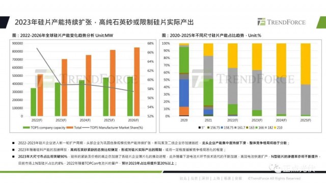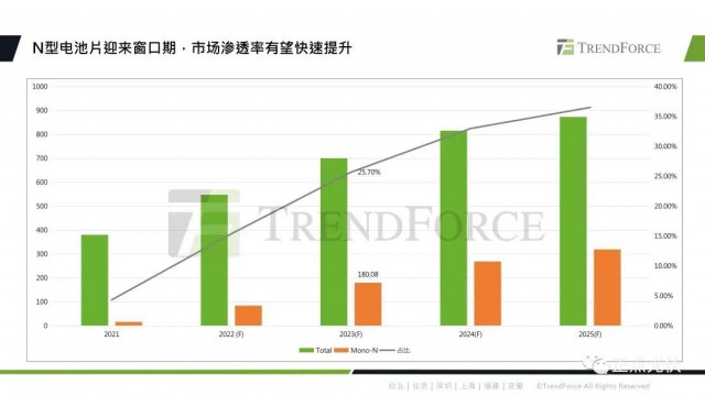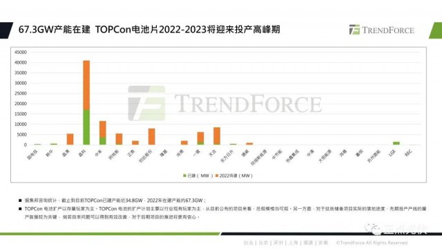 TOPCon因為它的性價比優(yōu)勢,實現(xiàn)了率先放量。預(yù)計到2023年底,N型電池片的產(chǎn)能將達(dá)到180GW,占比約為25.7%。