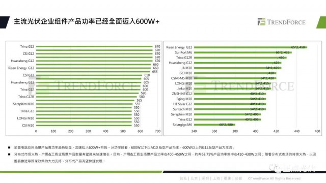 目前主流光伏企業(yè)組件產(chǎn)品功率已全面邁入了600W+,分功率段來看,600W以下以M10版型產(chǎn)品為主,600W以上的主要以G12版型產(chǎn)品為主。產(chǎn)品數(shù)量有望快速增長,目前來看,戶用及工商業(yè)場景產(chǎn)品功率大多在400到450W之間。隨著分布式市場的持續(xù)火熱,和整縣推進國家政策的大力支持,分布式產(chǎn)品有望快速發(fā)展。