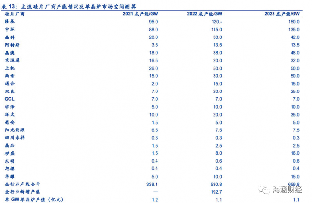①假設(shè)1:硅片大型化下,2023年182硅片為主流。據(jù)石英石網(wǎng),生產(chǎn)1GW182硅片需配備100臺(tái)單晶爐;