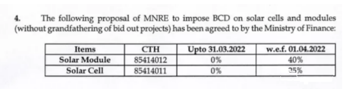 印度太陽(yáng)能制造商協(xié)會(huì)(ISMA)請(qǐng)?jiān)柑岢龊?,印度政府?022年4月1日起對(duì)光伏電池和組件分別征收25%和40%的基本關(guān)稅,征收的關(guān)稅涵蓋了被調(diào)查產(chǎn)品的整個(gè)范圍,一定程度上緩解了印度本土光伏行業(yè)的價(jià)格壓力。