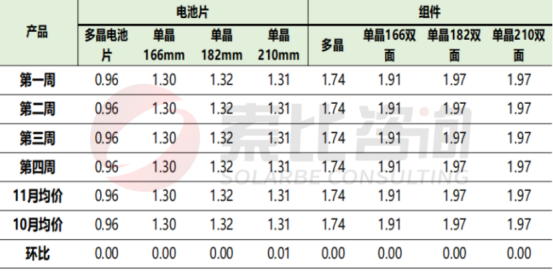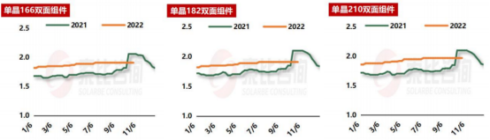 根據(jù)索比咨詢對多家組件制造商的調(diào)研:就11月組件價(jià)格行情來看,單晶166雙面均價(jià)1.91元/W,較10月環(huán)比持平;單晶182雙面均價(jià)1.97元/W,較10月環(huán)比持平;單晶210雙面均價(jià)1.97元/W,較10月環(huán)比持平。
