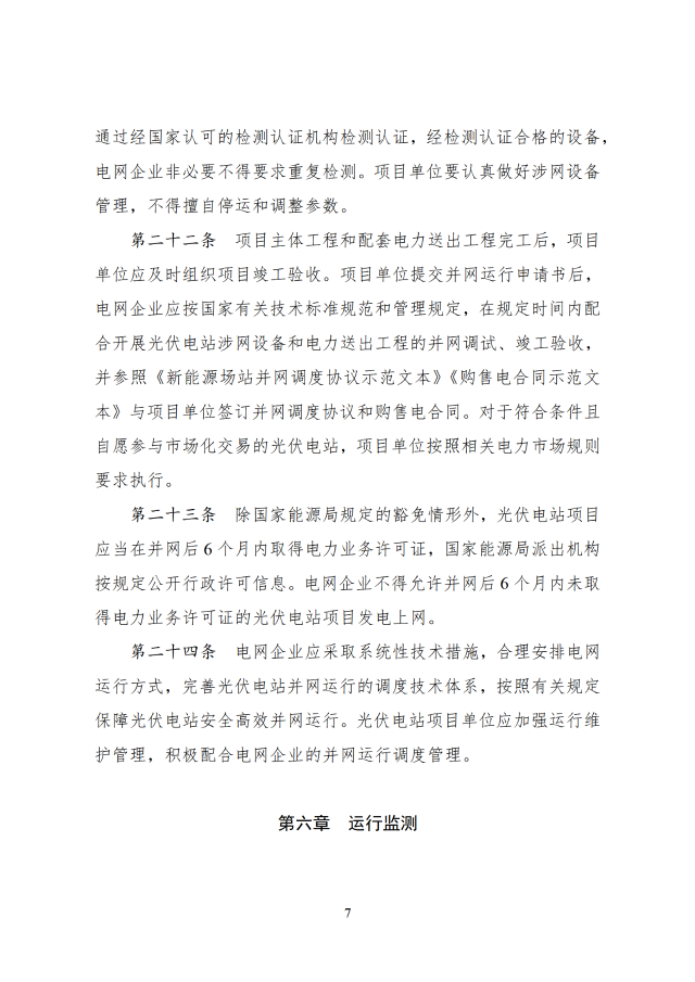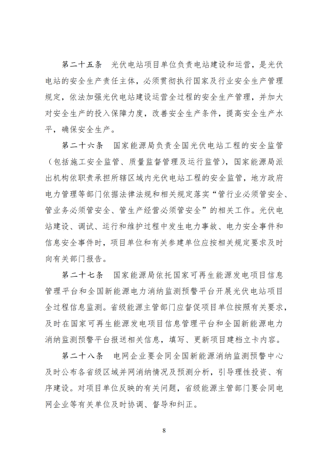 12月26日,國家能源局印發(fā)關(guān)于《光伏電站開發(fā)建設(shè)管理辦法》的通知,通知提到,國家能源局負(fù)責(zé)全國光伏電站開發(fā)建設(shè)和運(yùn)行的監(jiān)督管理工作,電網(wǎng)企業(yè)承擔(dān)光伏電站并網(wǎng)條件的落實(shí)或認(rèn)定、電網(wǎng)接入、調(diào)度能力優(yōu)化、電量收購等工作,配合各級能源主管部門分析測算電網(wǎng)消納能力與接入送出條件。有關(guān)方面按照國家法律法規(guī)和部門職責(zé)等規(guī)定做好光伏電站的安全生產(chǎn)監(jiān)督管理工作。