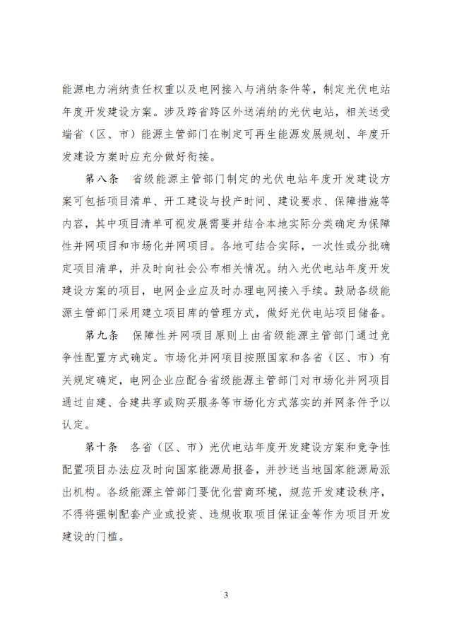 省級能源主管部門負(fù)責(zé)做好本省(區(qū)、市)可再生能源發(fā)展規(guī)劃與國家能源、可再生能源、電力等發(fā)展規(guī)劃和重大布局的銜接,根據(jù)本省(區(qū)、市)可再生能源發(fā)展規(guī)劃、非水電可再生能源電力消納責(zé)任權(quán)重以及電網(wǎng)接入與消納條件等,制定光伏電站年度開發(fā)建設(shè)方案。涉及跨省跨區(qū)外送消納的光伏電站,相關(guān)送受端省(區(qū)、市)能源主管部門在制定可再生能源發(fā)展規(guī)劃、年度開發(fā)建設(shè)方案時(shí)應(yīng)充分做好銜接。