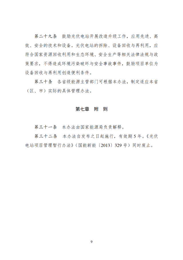 鼓勵(lì)光伏電站開展改造升級工作,應(yīng)用先進(jìn)、高效、安全的技術(shù)和設(shè)備。光伏電站的拆除、設(shè)備回收與再利用,應(yīng)符合國家資源回收利用和生態(tài)環(huán)境、安全生產(chǎn)等相關(guān)法律法規(guī)與政策要求,不得造成環(huán)境污染破壞與安全事故事件,鼓勵(lì)項(xiàng)目單位為設(shè)備回收與再利用創(chuàng)造便利條件。