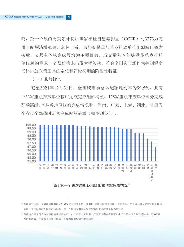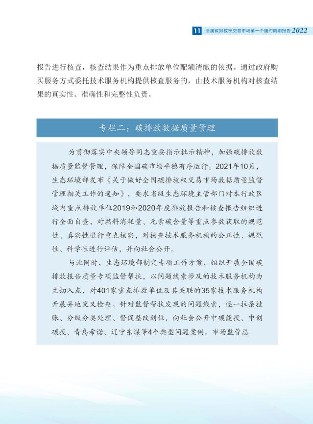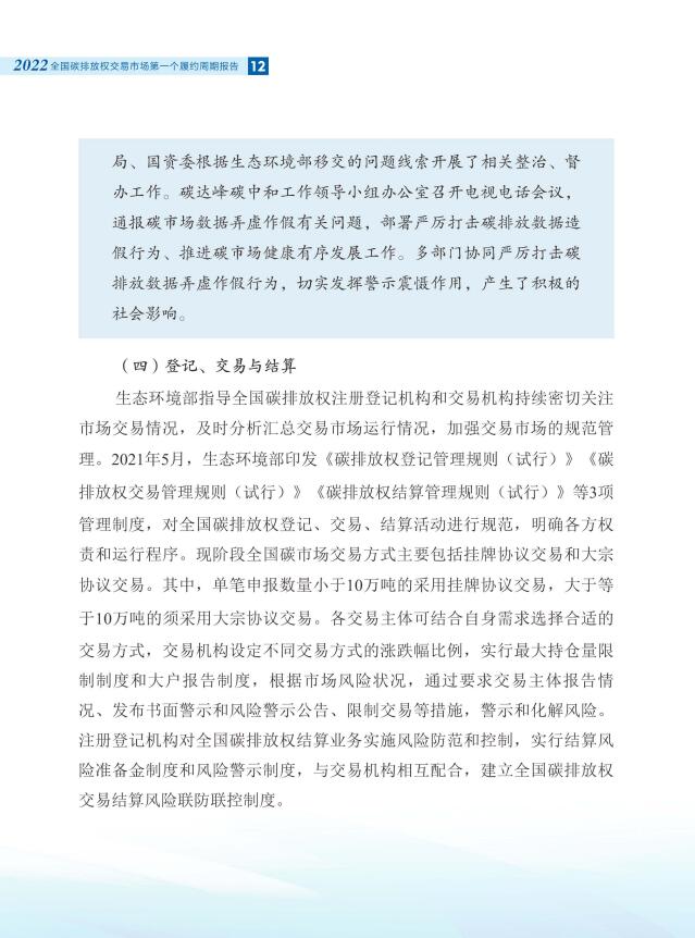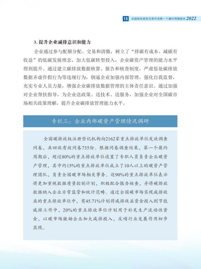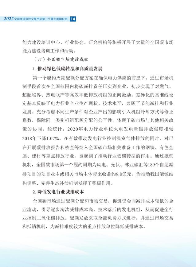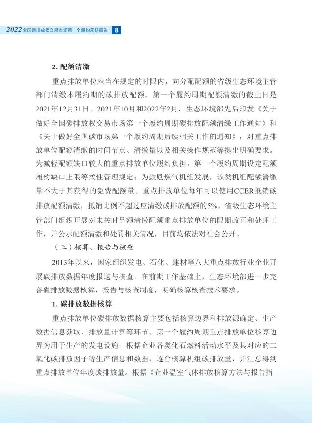 報告全面介紹了全國碳市場第一個履約周期市場交易和履約情況,對配額分配和清繳的工作考慮做了說明,總結(jié)梳理了碳排放核算、報告與核查制度體系建設進展,對加強重點排放單位數(shù)據(jù)質(zhì)量管理相關舉措做了介紹。