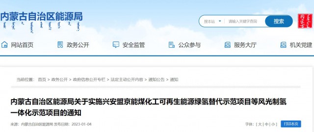 1月4日,內(nèi)蒙古能源局官網(wǎng)發(fā)布“內(nèi)蒙古自治區(qū)能源局關(guān)于實施興安盟京能煤化工可再生能源綠氫替代示范項目等風(fēng)光制氫一體化示范項目的通知”。
