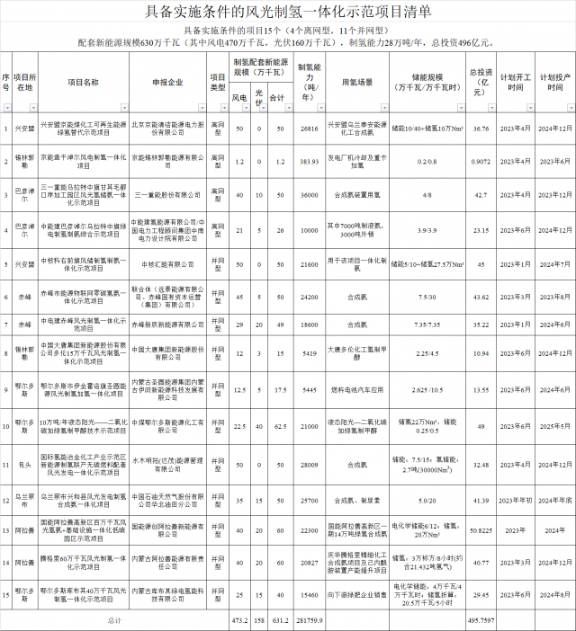 通知顯示:按照《內(nèi)蒙古自治區(qū)人民政府辦公廳關(guān)于促進(jìn)氫能產(chǎn)業(yè)高質(zhì)量發(fā)展的意見》和《內(nèi)蒙古自治區(qū)風(fēng)光制氫一體化示范項目實施細(xì)則(2022年版)》有關(guān)要求,經(jīng)自治區(qū)人民政府同意,計劃實施興安盟京能煤化工可再生能源綠氫替代示范項目等15個風(fēng)光制氫一體化示范項目。具備實施條件的項目15個(4個離網(wǎng)型,11個并網(wǎng)型),配套新能源規(guī)模631.2萬千瓦(其中風(fēng)電473.2萬千瓦,光伏158萬千瓦),制氫能力28.2萬噸/年,總投資495.8億元。