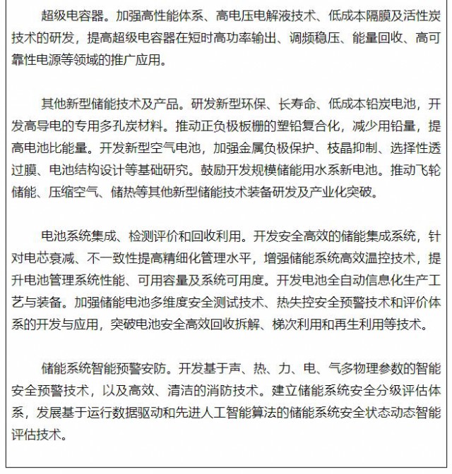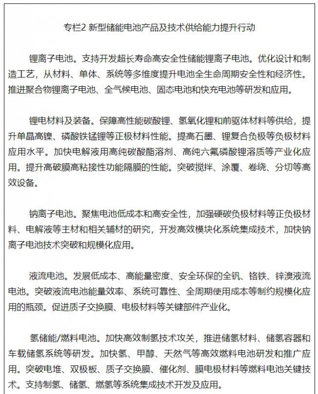 加強(qiáng)新型儲(chǔ)能電池產(chǎn)業(yè)化技術(shù)攻關(guān),推進(jìn)先進(jìn)儲(chǔ)能技術(shù)及產(chǎn)品規(guī)?;瘧?yīng)用。研究突破超長(zhǎng)壽命高安全性電池體系、大規(guī)模大容量高效儲(chǔ)能、交通工具移動(dòng)儲(chǔ)能等關(guān)鍵技術(shù),加快研發(fā)固態(tài)電池、鈉離子電池、氫儲(chǔ)能/燃料電池等新型電池。推廣智能化生產(chǎn)工藝與裝備、先進(jìn)集成及制造技術(shù)、性能測(cè)試和評(píng)估技術(shù)。提高鋰、鎳、鈷、鉑等關(guān)鍵資源保障能力,加強(qiáng)替代材料的開發(fā)應(yīng)用。推廣基于優(yōu)勢(shì)互補(bǔ)功率型和能量型電化學(xué)儲(chǔ)能技術(shù)的混合儲(chǔ)能系統(tǒng)。支持建立鋰電等全生命周期溯源管理平臺(tái),開展電池碳足跡核算標(biāo)準(zhǔn)與方法研究,探索建立電池產(chǎn)品碳排放管理體系。