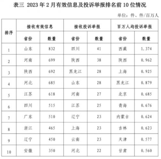 各?。ㄗ灾螀^(qū)、直轄市)按照接收的有效信息數(shù)量排序,山東、河南、陜西、河北、江蘇、四川、廣東、浙江、遼寧、安徽排在全國(guó)前10位;按照接收的投訴舉報(bào)數(shù)量排序,四川、陜西、黑龍江、山東、河南、江蘇、遼寧、上海、云南、河北排在全國(guó)前10位;按照百萬(wàn)人均投訴舉報(bào)數(shù)量排序,西藏、陜西、上海、黑龍江、北京、青海、內(nèi)蒙古、吉林、天津、甘肅排在全國(guó)前10位。(2023年2月有效信息及投訴舉報(bào)排名前10位情況見(jiàn)表三)