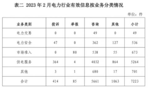 電力行業(yè)排在首位,有效信息數(shù)量為7223件,占全部有效信息的70.37%。群眾關(guān)注的內(nèi)容主要集中在供電服務(wù)、電力安全、成本價(jià)格和收費(fèi)等方面。(2023年2月電力行業(yè)有效信息按業(yè)務(wù)分類(lèi)情況見(jiàn)表二)