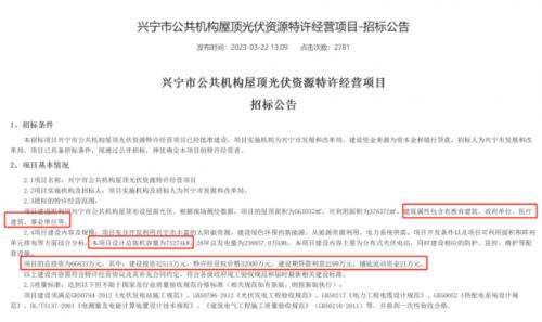 以興寧市招標(biāo)公告為例,招標(biāo)公告顯示,興寧市公共機(jī)構(gòu)屋頂光伏資源特許經(jīng)營(yíng)范圍為利用公共機(jī)構(gòu)屋頂布設(shè)屋頂光伏,規(guī)模為75.274MW,項(xiàng)目的總投資為66833萬元,其中:建設(shè)投資32513萬元,特許經(jīng)營(yíng)權(quán)價(jià)格32000萬元,建設(shè)期貸款利息2299萬元,鋪底流動(dòng)資金21萬元。按照這一數(shù)據(jù)折算,興寧市整縣光伏單瓦投資成本為8.88元/瓦,對(duì)應(yīng)的特許權(quán)經(jīng)營(yíng)費(fèi)為4.25元/瓦。