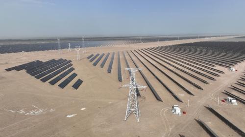 粵水電巴楚光伏項(xiàng)目位于巴楚縣三岔口,該項(xiàng)目總建設(shè)用地面積約9.3萬畝,總建設(shè)規(guī)模為307萬千瓦,共分五期建設(shè)。目前已并網(wǎng)裝機(jī)容量67萬千瓦,可減少碳排放約100萬噸。
