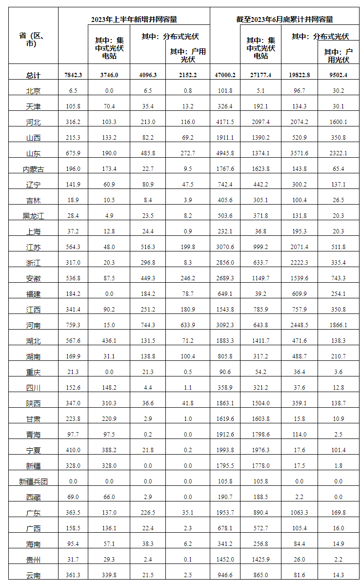 國(guó)家能源局7月27日發(fā)布的光伏發(fā)電建設(shè)運(yùn)行情況顯示,2023年上半年新增并網(wǎng)容量7842.3萬千瓦,其中集中式光伏電站為3746萬千瓦,分布式光伏為4096.3萬千瓦。