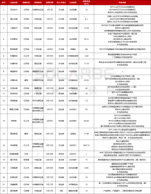 索比光伏網(wǎng)據(jù)公開數(shù)據(jù)統(tǒng)計,今年以來IPO獲得受理的光伏公司共有22家,包括3家太陽能電池企業(yè),光伏膠膜、光伏玻璃、逆變器、EPC企業(yè)各2家,還有多晶硅、光伏漿料、石英坩堝、接線盒等環(huán)節(jié)企業(yè),擬募資額合計超1285億元,其中華電新能以804.12億元的募資額創(chuàng)下目前A股新能源領(lǐng)域的最大規(guī)模IPO記錄。