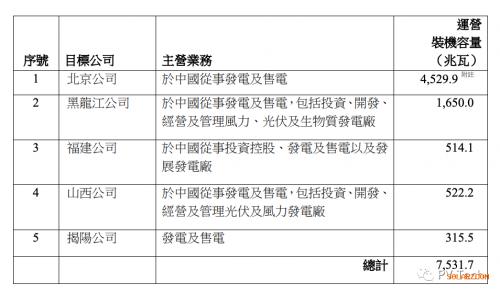 據(jù)悉,目標(biāo)公司I及目標(biāo)公司II主要從事清潔能源發(fā)電,主要包括風(fēng)力發(fā)電及光伏發(fā)電。收購事項(xiàng)涉及收購總?cè)萘繛?,268.3兆瓦(包括已投運(yùn)7,531.7兆瓦,在建1,736.6兆瓦)的發(fā)電項(xiàng)目。