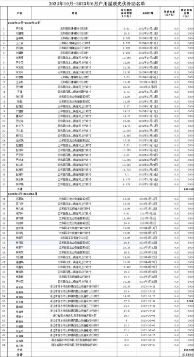根據(jù)《關(guān)于戶用光伏發(fā)電項目補助有關(guān)事項的通知》(云發(fā)改辦〔2021〕79號)文件精神,2022年10-2023年6月的戶用光伏項目業(yè)主向縣發(fā)改局申請了資金補助,縣發(fā)改局與電力部門進行了核對后,確定了補助名單和金額。現(xiàn)將補助名單和補助金額進行公示,詳見附表。