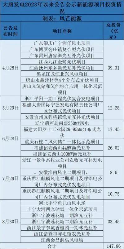 根據(jù)公開信息不完全統(tǒng)計,2023年以來,大唐發(fā)電共發(fā)布5個新能源項目投資計劃公告。其中,風、光項目共計27個,總投資超147.86億元。