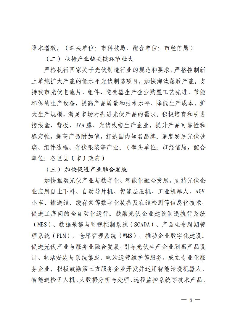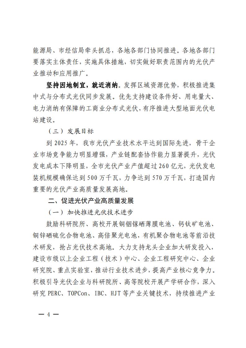 文件指出,到2025年,我市光伏產(chǎn)業(yè)技術(shù)水平達(dá)到國際先進(jìn),骨干企業(yè)市場競爭能力明顯增強(qiáng),產(chǎn)業(yè)鏈配套協(xié)作能力顯著提升,光伏發(fā)電成本下降明顯,全市光伏產(chǎn)業(yè)產(chǎn)值超過260億元,光伏發(fā)電裝機(jī)規(guī)模確保達(dá)到500萬千瓦,力爭達(dá)到570萬千瓦,打造國內(nèi)重要的光伏產(chǎn)業(yè)高質(zhì)量發(fā)展高地。