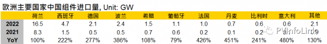 目前中國主要出口成長的區(qū)域市場,仍是目前能源轉(zhuǎn)型最積極,同時(shí)也因俄羅斯和烏克蘭沖突下能源供應(yīng)不穩(wěn)定而面臨能源危機(jī)的歐洲。歐洲五月從中國進(jìn)口了8.9GW的光伏組件,同比成長146%,1 – 5月則是累計(jì)了33.3GW,同比成長144%,為各區(qū)域市場中成長最高。2021年歐洲全年進(jìn)口量已經(jīng)是最高的40.9GW,占中國2021年出口的46%,在基期已高且今年仍呈現(xiàn)逐月成長的態(tài)勢(shì)下,印證了歐洲市場對(duì)于光伏產(chǎn)品的需求仍然強(qiáng)勁。