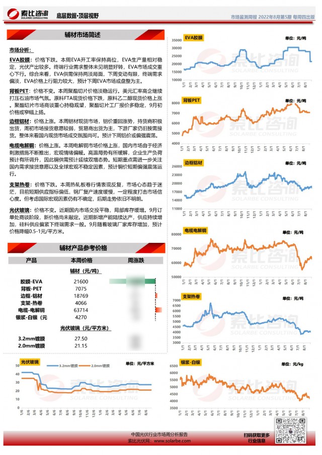 光伏產(chǎn)業(yè)周監(jiān)測報告系索比咨詢對于光伏產(chǎn)業(yè)鏈上下游價格的監(jiān)測與預(yù)報,幫助企業(yè)獲得最實時的參考價格。每周除了對硅料、硅片、電池片、組件、輔材等價格進行追蹤和分析外,亦關(guān)注下游招標動態(tài),并對后續(xù)市場趨勢做出研判。