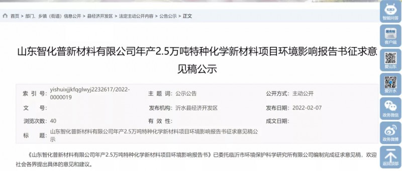據(jù)悉,山東智化普新材料有限公司年產(chǎn)2.5萬噸特種化學(xué)新材料項目目前正在進(jìn)行環(huán)評。