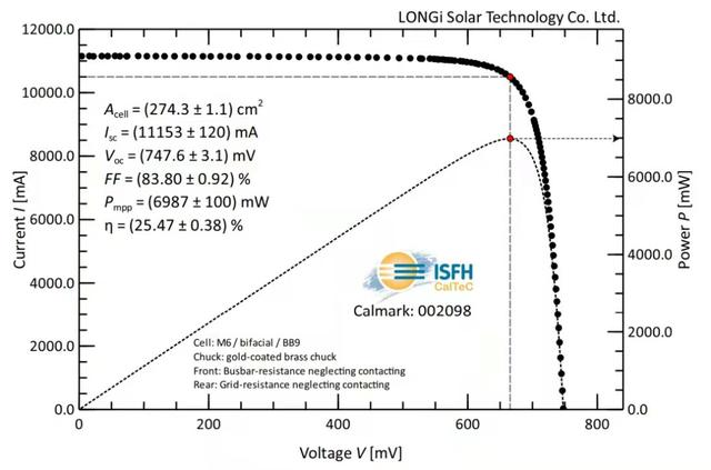 3月29日,經(jīng)德國哈梅林太陽能研究所(ISFH)認(rèn)證,隆基采用摻鎵p型硅片制備的硅異質(zhì)結(jié)電池(p-HJT)獲得效率新突破:完全利用可量產(chǎn)工藝在全尺寸(M6尺寸,面積274.3cm)單晶硅片上,創(chuàng)造了轉(zhuǎn)換效率為25.47%的大尺寸p型光伏電池效率世界紀(jì)錄,進(jìn)一步驗證了低成本異質(zhì)結(jié)量產(chǎn)技術(shù)的可行性。