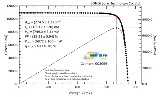 3月31日,繼3月29日宣布p-HJT 以25.47%打破世紀(jì)紀(jì)錄后,經(jīng)德國哈梅林太陽能研究所(ISFH)認(rèn)證,隆基研發(fā)團(tuán)隊在M6全尺寸(274.5cm2)單晶硅片上創(chuàng)造了無銦HJT電池25.40%轉(zhuǎn)換效率的新世界紀(jì)錄,持續(xù)夯實HJT電池低成本技術(shù)路線的產(chǎn)業(yè)化基礎(chǔ)。