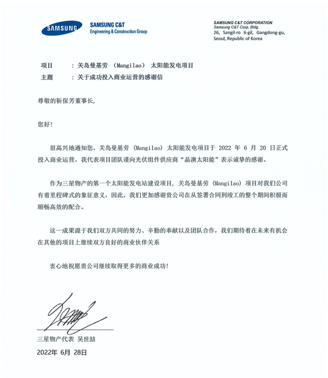 為表示對晶澳在項(xiàng)目建設(shè)過程中的大力支持以及對晶澳高品質(zhì)產(chǎn)品的贊賞和感謝,三星物產(chǎn)在項(xiàng)目建成后特寄來感謝信,以表謝意。三星物產(chǎn)在感謝信中寫道:“作為三星物產(chǎn)的第一個太陽能發(fā)電站建設(shè)項(xiàng)目,關(guān)島曼基勞項(xiàng)目對我們公司有著里程碑式的象征意義,因此,我們更加感謝貴公司在從簽署合同到竣工的整個期間積極而順暢高效的配合?!?/p>