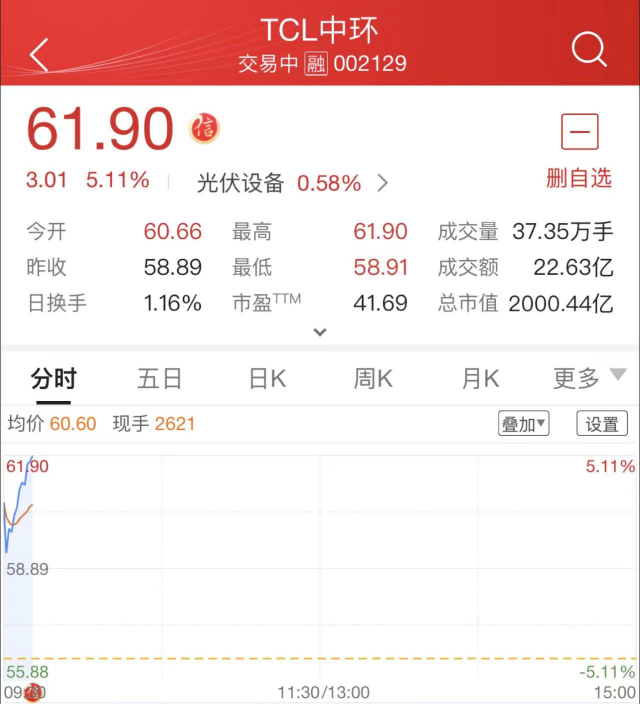 7月1日,TCL中環(huán)(SZ:002129)股價(jià)繼續(xù)延續(xù)強(qiáng)勢表現(xiàn),總市值首次突破2000億元!截至上午9時(shí)41分,公司股價(jià)大漲5.16%,總市值達(dá)到2010.63億元!自6月27日以來的五個(gè)交易日內(nèi),TCL中環(huán)股價(jià)最高漲幅高達(dá)33%!