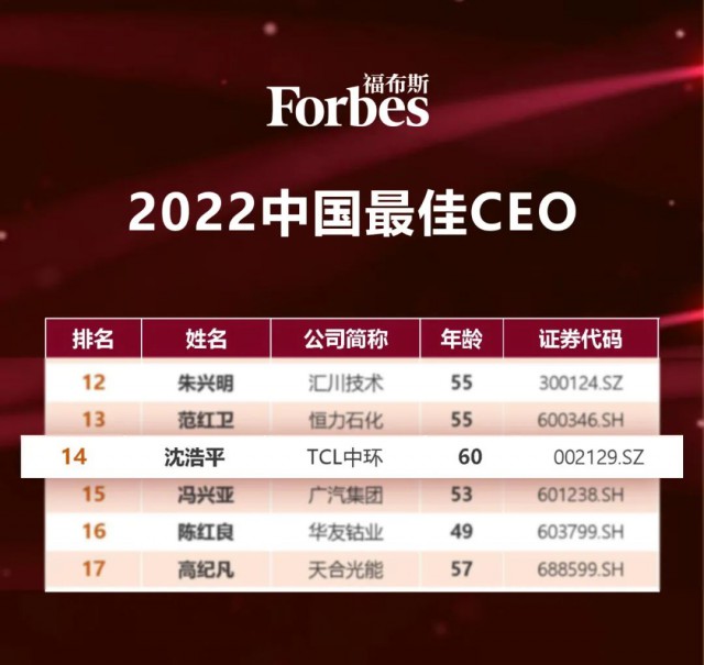 8月18日,福布斯中國(guó)發(fā)布2022中國(guó)最佳CEO榜,TCL中環(huán)總經(jīng)理沈浩平入選,位列第14位。