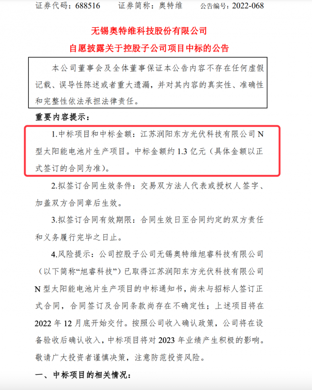 奧特維公司控股子公司中標(biāo)潤(rùn)陽(yáng)東方光伏科技N型電池片生產(chǎn)項(xiàng)目,中標(biāo)金額約1.3億元。