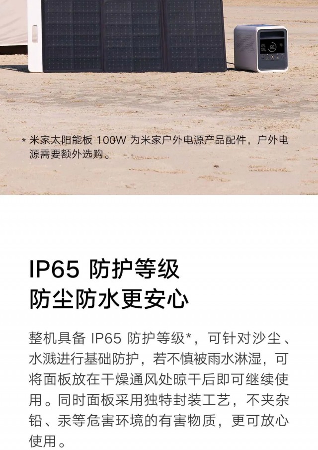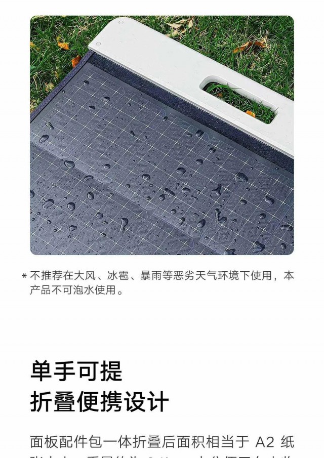 此外,米家太陽能板100W整機(jī)具備IP65防護(hù)等級,可針對沙塵、水濺等進(jìn)行基礎(chǔ)防護(hù)。面板配件包一體折疊后面積相當(dāng)于A2紙張大小,重量約為3.1kg,十分便于車內(nèi)收納與存放。提手外漏設(shè)計(jì),戶外出行單手可提,隨心移動(dòng)便攜無憂。