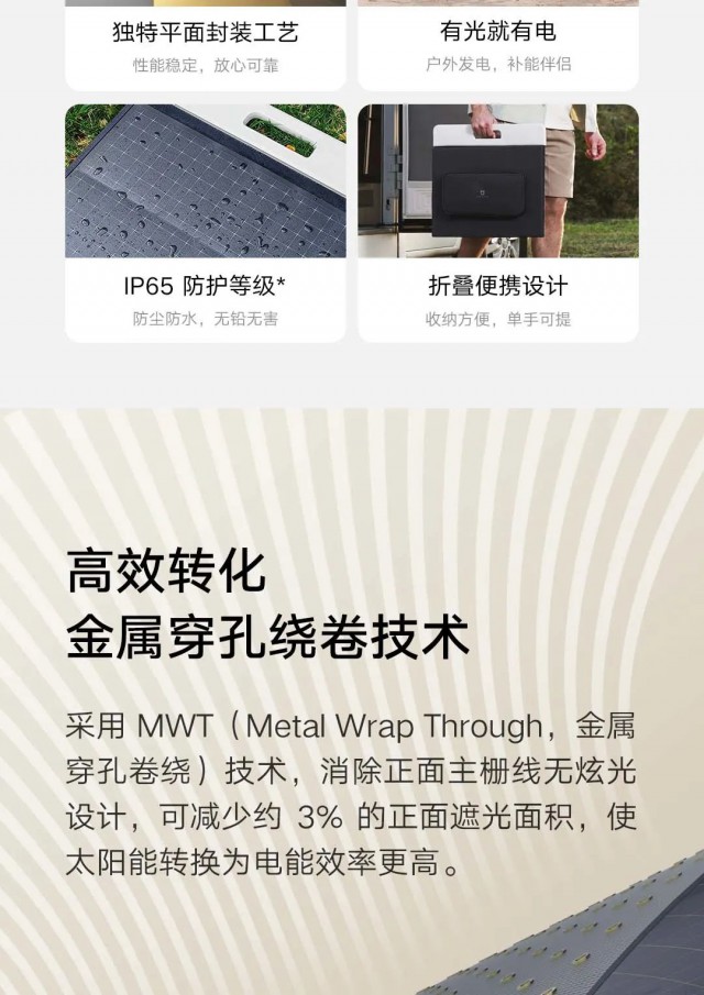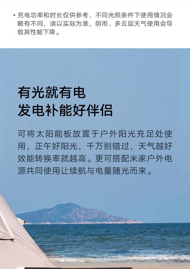 米家太陽能板100W擁有最高100W MAX大功率,可搭配戶外電源進(jìn)行快速補(bǔ)能,同時(shí)支持邊曬邊充,戶外有光就有電。