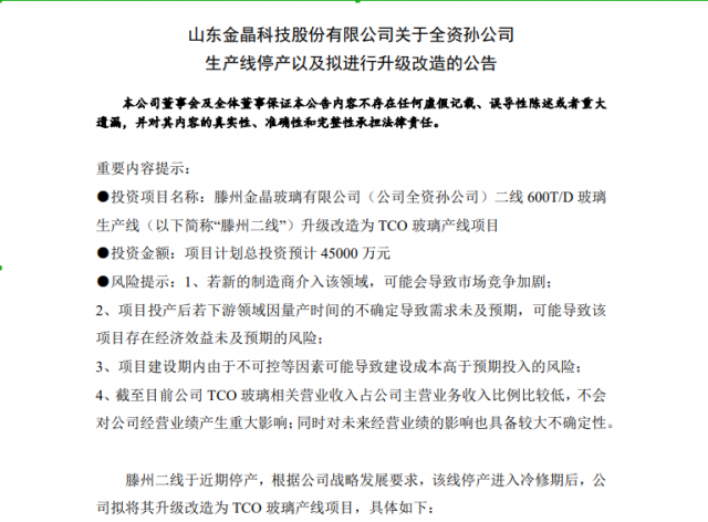 金晶科技9月12日公告,2012年9月8日滕州金晶玻璃有限公司(公司全資孫公司)二線600T/D 玻璃生產(chǎn)線(“滕州二線”)點火運行,截至目前已經(jīng)達(dá)到設(shè)計窯齡,目前窯爐侵蝕狀況比較嚴(yán)重,窯爐運行安全存在一定隱患,鑒于此,公司于近期對其停產(chǎn)。