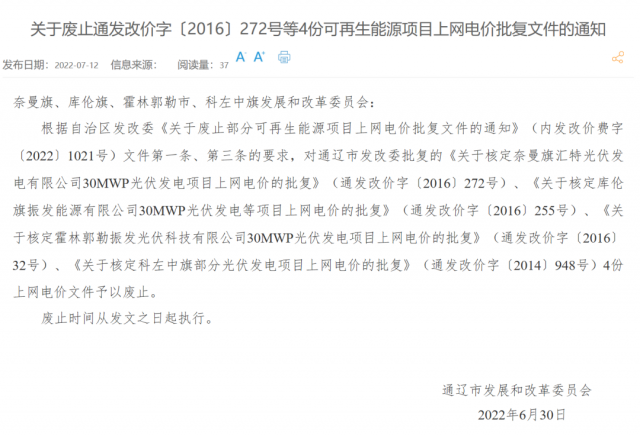 此前,太極實(shí)業(yè)(600667)8月4日晚間公告,公司關(guān)注到內(nèi)蒙古發(fā)改委官網(wǎng)刊登的《關(guān)于廢止部分可再生能源項(xiàng)目上網(wǎng)電價(jià)批復(fù)文件的通知》,涉及子公司五個(gè)集中式光伏電站;所涉電站將不再享受電費(fèi)補(bǔ)貼,公司將對所涉電站評估后計(jì)提固定資產(chǎn)減值準(zhǔn)備,初步測算固定資產(chǎn)減值金額為3.28億元左右。該項(xiàng)固定資產(chǎn)減值預(yù)計(jì)將減少公司2022年上半年凈利潤3.28億元左右,占最近一期經(jīng)審計(jì)凈利潤的36.12%。同時(shí),本次電價(jià)批復(fù)廢止將導(dǎo)致所涉電站電價(jià)補(bǔ)貼被取消,經(jīng)初步測算,預(yù)計(jì)減少公司2022年下半年光伏發(fā)電業(yè)務(wù)收入4906萬元左右,減少公司2022年下半年凈利潤4170萬元左右。
