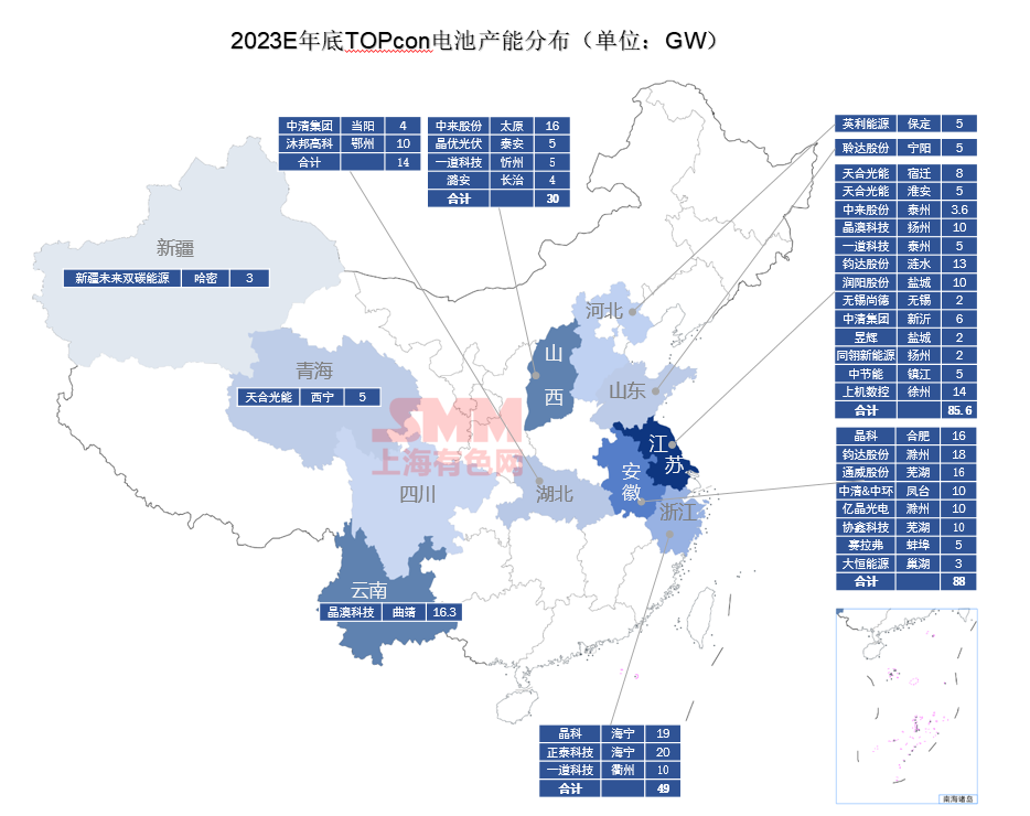 SMM整理了今明年的Topcon電池產(chǎn)能地域分布如下圖示: