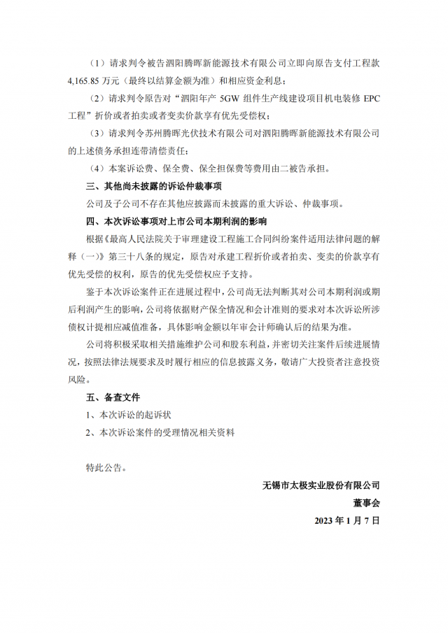 1月7日,太極實(shí)業(yè)發(fā)布公告,公司子公司信息產(chǎn)業(yè)電子第十一設(shè)計(jì)研究院科技工程股份有限公司(以下簡稱“十一科技”)與蘇州騰暉光伏技術(shù)有限公司(以下簡稱“蘇州騰暉”)及其子公司存在建設(shè)工程施工合同糾紛,十一科技已向法院提起訴訟及財產(chǎn)保全。本次相關(guān)訴訟案件共6件,合計(jì)涉案金額約3.88億元。目前,上述六起案件僅一件已被法院受理,其余訴訟案件,十一科技均已向法院遞交訴訟材料,目前正處于受理中。