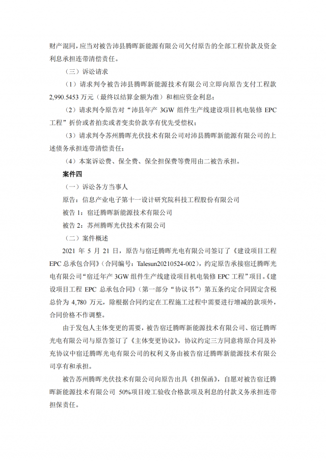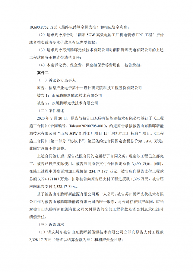 2020年~2021年期,十一科技與蘇州騰暉的六家全資子公司泗陽騰暉光電有限公司、山東騰暉新能源技術(shù)有限公司、沛縣騰暉新能源技術(shù)有限公司、宿遷騰暉新能源技術(shù)有限公司、山東騰暉光電有限公司、泗陽騰暉新能源技術(shù)有限公司簽訂了多筆項(xiàng)目施工承包合同,但上述六家企業(yè)并未全部付清工程款。