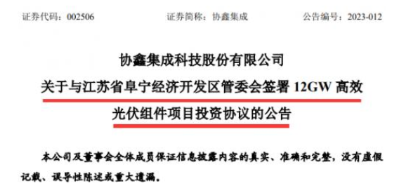 2月15日,協(xié)鑫集成發(fā)布公告稱,該公司擬在江蘇省阜寧經(jīng)濟(jì)開(kāi)發(fā)區(qū)投資建設(shè)12GW高效光伏組件項(xiàng)目。