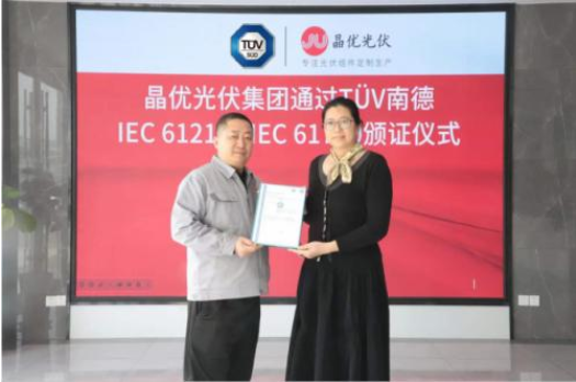 晶優(yōu)光伏集團專注光伏組件定制生產,致力于向客戶提供從高效光伏組件產品定制化到生產服務。TÜV南德針對晶優(yōu)光伏集團的單玻和雙玻182/210光伏組件做了IEC 61215、IEC 61730全序列測試,整個測試周期該182、210光伏組件表現(xiàn)良好,最終通過TÜV南德檢測并收獲TÜV南德認證證書。TÜV南德認證證書的收獲是對晶優(yōu)光伏集團該款光伏產品設計和工廠質量保證的雙重認可,有力證明了其產品的穩(wěn)定性及可靠性,確保為全球客戶交付高質高效的光伏組件。