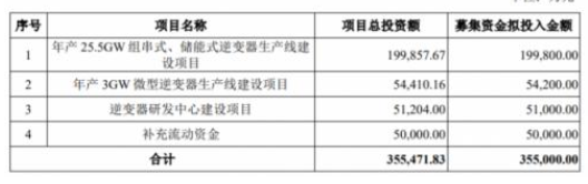 本次定增擬募集資金總額不超過(guò)35.5億元,扣除發(fā)行費(fèi)用后,將用于年產(chǎn)25.5GW組串式、儲(chǔ)能式逆變器生產(chǎn)線建設(shè)項(xiàng)目;年產(chǎn)3GW微型逆變器生產(chǎn)線建設(shè)項(xiàng)目;逆變器研發(fā)中心建設(shè)項(xiàng)目和補(bǔ)充流動(dòng)資金。